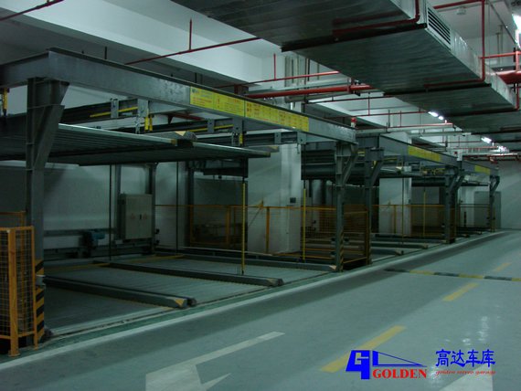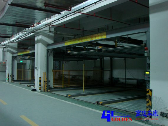 升降橫移式立體停車庫(kù)的出入口在地面層,最高層的載車板只能做升降動(dòng)作,地面層的載車板只能做橫移動(dòng)作;中間層載車板既可做升降動(dòng)作又可做橫移動(dòng)作。中間層均設(shè)有空位,車臺(tái)板通過橫移動(dòng)作變換位置,從而橫移出空位,而上層的汽車做下降動(dòng)作,從而取出汽車,地面層汽車無(wú)須運(yùn)動(dòng)便可直接開出。