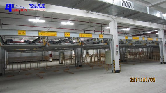 升降橫移式立體停車庫的出入口在地面層,最高層的載車板只能做升降動(dòng)作,地面層的載車板只能做橫移動(dòng)作;中間層載車板既可做升降動(dòng)作又可做橫移動(dòng)作。中間層均設(shè)有空位,車臺(tái)板通過橫移動(dòng)作變換位置,從而橫移出空位,而上層的汽車做下降動(dòng)作,從而取出汽車,地面層汽車無須運(yùn)動(dòng)便可直接開出。